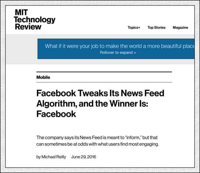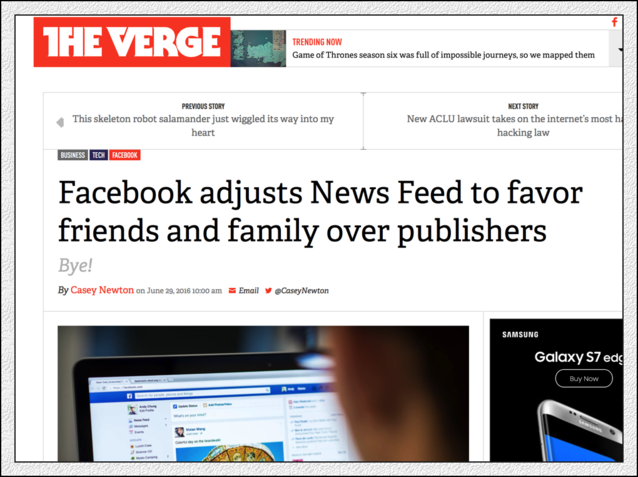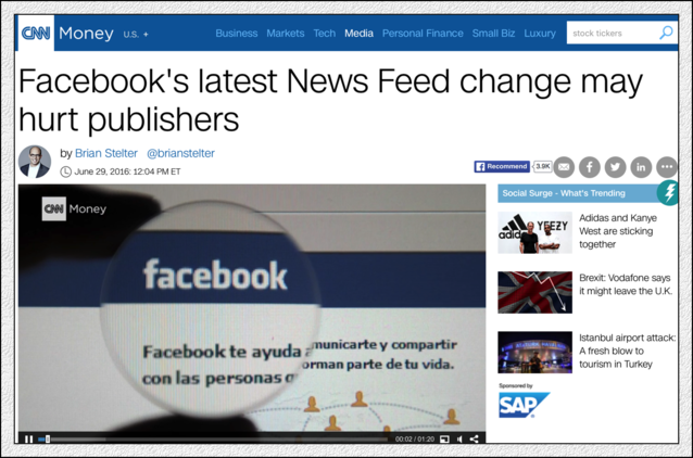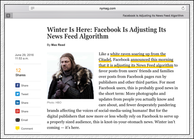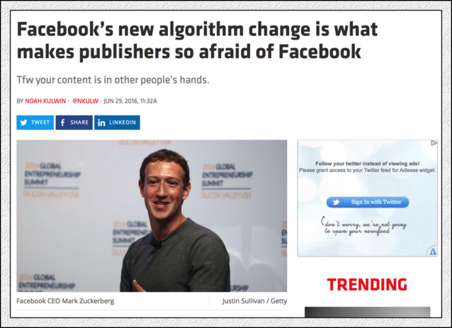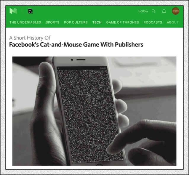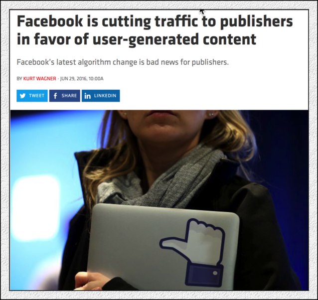 6月底,F(xiàn)acebook又公布調(diào)整算法了,這回調(diào)整,受傷的仍是媒體(Publishers)。幾乎所有的美國(guó)媒體這幾天討論的都是Facebook算法,以及自己身上正在流血的傷口。可怕的是,媒體們?cè)谶M(jìn)行這次報(bào)道的時(shí)候,洋溢的是某種哀怨,而不是憤怒。他們憤怒,但表現(xiàn)的只是哀怨。與狼共舞,不時(shí)地被狼咬上一口,很正常的。 在2016年5月經(jīng)歷了“Facebook新聞偏見門”、Facebook “蒂爾門”兩次沖擊之后,美國(guó)的媒體可能無法想象,這么快又會(huì)面對(duì)一次來自Facebook的新的震撼教育。