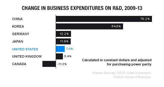 根據(jù)杜克大學商學院的研究,在2009-2013年之間,各國貿易投入在R&D (Research & Development)研發(fā)的比重來看,中國的研發(fā)比例儼然超過美國一大截。