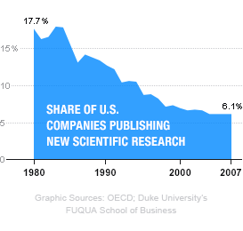 假如將歷史周期再拉的長一點,從1980年到2007年,美國在研發(fā)上的本錢比重,降低的速度已然讓人驚奇。尤其是參考在新科學研究領域的專業(yè)文章數(shù)目來看,已然從17.7%下降到了6.1%。杜克大學的研究教授Ashish Arora表示,從資本市場的反饋來說,越是注重研發(fā)的企業(yè)的市值,反而不如在研發(fā)上投入較小的企業(yè)的市值評估。他說,相對于35年之前,現(xiàn)在的企業(yè)對于基礎科學的看重減少了,而需求就更少了。
