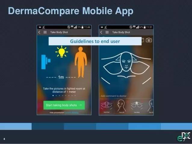 「DermaCompare 這款應(yīng)用可以讓患者通過簡(jiǎn)樸數(shù)字?jǐn)z像頭拍攝的『全身攝影(TBP)』,進(jìn)行自我皮膚檢查!筗ayne說道。用戶可以自行下載應(yīng)用和解釋說明到任何帶有數(shù)字?jǐn)z像頭的設(shè)備上。 Wayne 解釋說,一旦病人將他或她的「全身攝影」圖像上傳到他們?cè)?nbsp;DermaCompare 云服務(wù)器的私有文件,以便存儲(chǔ)和預(yù)覽,那么,DermaCompare 平臺(tái)就會(huì)(1)將圖像與病人文件中的任意歷史圖像進(jìn)行比對(duì),同時(shí)也和公司數(shù)據(jù)庫(kù)相關(guān)的圖像進(jìn)行比對(duì);(2)更新病人的文件,創(chuàng)建一個(gè)數(shù)據(jù)要點(diǎn)摘要,列出和病人皮膚圖像緊急相關(guān)的數(shù)據(jù),以及任何可疑的圖像變化的預(yù)警信息;(3)通知相關(guān)醫(yī)生獲取、審視打印好的病人的數(shù)據(jù)圖表和全身攝影圖像。它會(huì)自動(dòng)地匹配云服務(wù)器中五千萬種已知痣斑圖像以及病人的歷史圖像。這項(xiàng)技術(shù)極大地增強(qiáng)了醫(yī)生檢測(cè)玄色素瘤的精準(zhǔn)度和速度。