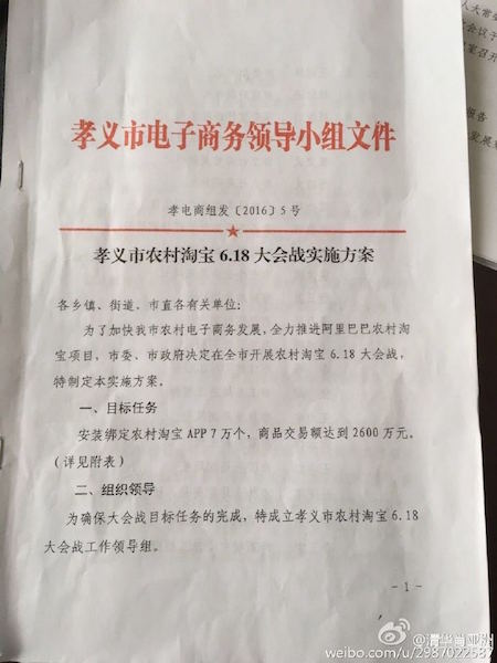 當前,競爭日趨慘烈的“6.18”大戰(zhàn)終于落下帷幕,各大電商平臺紛紛曬出自己的“成績單”。根據(jù)農(nóng)村淘寶宣布的數(shù)據(jù),家電類產(chǎn)品在今年618期間銷量最佳,農(nóng)村淘寶好像已儼然成為家電數(shù)碼產(chǎn)品下鄉(xiāng)的主陣地。 然而,在阿里村淘看似繁榮的營銷數(shù)據(jù)背后,卻躲藏著行政干涉干與這只怪手。據(jù)傳,山西孝義市近期就發(fā)布了一份令人咋舌的文件,要求下級單位配合完成阿里村淘6.18交易額等指標。 一、為推進阿里村淘項目,孝義市強制向下攤派消費指標 日前,網(wǎng)絡上曝出一份山西省孝義市電子商務領(lǐng)導小組下發(fā)的紅頭文件,引來網(wǎng)友的廣泛關(guān)注和吐槽。文件內(nèi)容顯示,該市要求下級單位完成農(nóng)村淘寶在6.18期間的APP安裝量和交易額指標。 詳細來看,孝義市擬定在2016年6月1日至19日期間,完成“安裝綁定農(nóng)村淘寶APP 7萬個,商品交易額達到2600萬元”的目標任務。為此,孝義市將指標細化后,對市委、宣傳部等機關(guān)及企事業(yè)單位下發(fā)了明確的任務指標,甚至轄下的各鄉(xiāng)鎮(zhèn)、礦區(qū)和學校都被分配了上百、上千的APPA綁定任務。 同時,孝義市要求各鄉(xiāng)鎮(zhèn)、街道和市直有關(guān)單位分別進行一條龍排隊,考核成績納入年終責任制考核。考核依托阿里巴巴公司為大會戰(zhàn)工作領(lǐng)導組組長、副組長、辦公室主任分別安裝后臺APP治理系統(tǒng),隨時把握各單位任務目標完成情況。