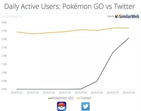 (豈非 Pokémon Go 已經(jīng)可以影響到荷爾蒙的分泌了么。。。) 甚至連 Twitter 都未必擋的住。。。 Pokémon GO 與 Twitter 的日活躍用戶量對比 玄色是Pokémon GO,黃色是 Tinder