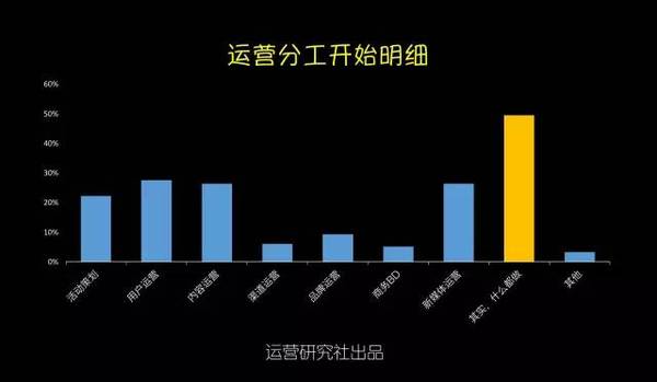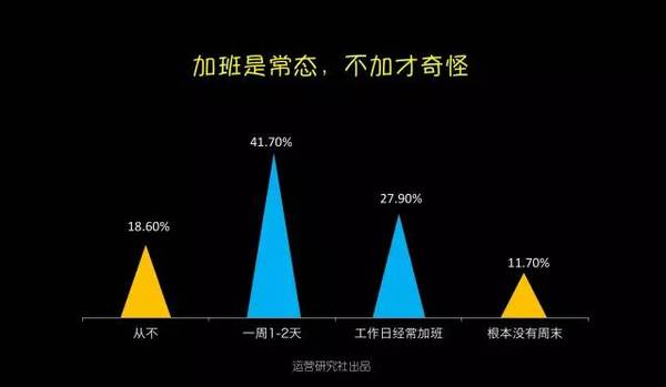1、運(yùn)營(yíng)從業(yè)者的男女比例? 運(yùn)營(yíng)從業(yè)者的在性別占比上,15年仍是男生略勝女生,今年則是被完勝10個(gè)百分點(diǎn)。無(wú)論是在哪家公司做運(yùn)營(yíng),都能夠顯著的感覺(jué)的陰盛陽(yáng)衰。不知道大家是否跟我一樣,尋思著男同胞們都上哪工作了。 不外話說(shuō)歸來(lái),嘴上在嘀咕,作為男生心里仍是美著呢,究竟身邊美女圍著轉(zhuǎn),加班搬磚也帶勁。 2、運(yùn)營(yíng)從業(yè)者的春秋組成? 在16年的運(yùn)營(yíng)從業(yè)者中有64.2%是90后,工作十年以上的老司機(jī)偏少。項(xiàng)目落地靠90后,掌舵還得靠85前,真正享有運(yùn)營(yíng)決議計(jì)劃?rùn)?quán)的是30歲以上的運(yùn)營(yíng)白叟。他們?cè)诨ヂ?lián)網(wǎng)剛起步階段就開始在運(yùn)營(yíng)領(lǐng)域摸爬滾打,固然人數(shù)只占了6.6%卻把握了80%的運(yùn)營(yíng)資源。 3、運(yùn)營(yíng)從業(yè)者的工作方向? 運(yùn)營(yíng)是個(gè)框什么都能夠往里裝,每次朋友聚會(huì)被問(wèn)到在做什么的時(shí)候,你是不是也會(huì)緊張,然后腦子里快速閃過(guò)最近做的事情,試圖給自己做工作下個(gè)詳細(xì)的定義,可終極仍是有49.5%的運(yùn)營(yíng)無(wú)法改變“實(shí)在自己什么都做”的真相。 不外從16年運(yùn)營(yíng)人生存現(xiàn)狀調(diào)查的結(jié)果中我看到了一個(gè)好的趨勢(shì):運(yùn)營(yíng)分工開始明細(xì)。內(nèi)容和用戶運(yùn)營(yíng)的相關(guān)從業(yè)者比例晉升到了26%,新媒體運(yùn)營(yíng)的比例在下降,越來(lái)越多的企業(yè)開始意識(shí)到對(duì)產(chǎn)品本身運(yùn)營(yíng)的價(jià)值高過(guò)在新媒體渠道的盲目跟進(jìn)。 4、運(yùn)營(yíng)從業(yè)者的工作年限分布? 據(jù)某著名招聘網(wǎng)站數(shù)據(jù)顯示,互聯(lián)網(wǎng)的整體從業(yè)者中工作經(jīng)驗(yàn)在3年以下的為37.46%,而單從運(yùn)營(yíng)崗位分析,0-3歲的運(yùn)營(yíng)卻占到了91.5%,比擬于技術(shù)、產(chǎn)品、設(shè)計(jì),運(yùn)營(yíng)作為互聯(lián)網(wǎng)的新興崗位還有很長(zhǎng)的路要走。 另外,今年1-3歲運(yùn)營(yíng)的占比超過(guò)了0-1歲運(yùn)營(yíng),看來(lái)仍是有蠻多人選擇在運(yùn)營(yíng)這條路上堅(jiān)持的。 5、運(yùn)營(yíng)從業(yè)者的薪資收入? 運(yùn)營(yíng)也算是拼資歷了,薪資分布和從業(yè)年限的分布在整體上一致。受工作年限的影響,79.8%的人工資不超過(guò)10K,只有少部門運(yùn)營(yíng)突破經(jīng)驗(yàn)限制拿到了10K以上。 今年互聯(lián)網(wǎng)行業(yè)整體均勻薪資晉升了,但是1-3年運(yùn)營(yíng)從業(yè)者的薪資水平反倒泛起了下降,相信不少人又該(被)拖后腿了。 6、你運(yùn)營(yíng)的產(chǎn)品用戶規(guī)模? 受資本寒冬的影響,今年未上線的產(chǎn)品占比從去年的27.6%下降到了17.8%,用戶規(guī)模在10萬(wàn)-100萬(wàn)的產(chǎn)品比例晉升了2個(gè)百分點(diǎn)。 對(duì)于互聯(lián)網(wǎng)創(chuàng)業(yè)來(lái)說(shuō)10萬(wàn)用戶規(guī)模是條坎,還有46.1%的產(chǎn)品在努力沖破這條生命線,往前推進(jìn)意味著融資加速,整體運(yùn)營(yíng)節(jié)奏也能夠上正軌。 7、你需要加班嘛? 超過(guò)81.4%的運(yùn)營(yíng)需要加班,更糟糕的是有11.7%的從業(yè)者根本就沒(méi)有周末。拼一點(diǎn)的創(chuàng)業(yè)公司正常的作息時(shí)間是“10-10-6”,也就是每周需要工作6天,周末碰到產(chǎn)品或者流動(dòng)上線基本上就是繼承加班了。 即使不在創(chuàng)業(yè)公司,有一些社區(qū)的運(yùn)營(yíng),周末除了需要更新內(nèi)容和首頁(yè)物料,碰到熱門事件還得出內(nèi)容做專題,工作節(jié)奏完全遇上了戰(zhàn)地記者。對(duì)嚴(yán)苛要求自己的運(yùn)營(yíng)來(lái)說(shuō),糊口即工作,工作即糊口,單身只身汪恨不得把家搬公司了。18.6%表示從不加班的運(yùn)營(yíng),不知道你們公司還招人嗎? 8、你在工作中最缺什么? 跟運(yùn)營(yíng)從業(yè)者中大部門是90后有關(guān),65.5%的運(yùn)營(yíng)都是工作狂,在他們眼里個(gè)人工作成就感比什么都重要。 另外一個(gè)比較讓長(zhǎng)輩們擔(dān)心的現(xiàn)象是:運(yùn)營(yíng)從業(yè)者把找另一半的優(yōu)先級(jí)放在掙錢、個(gè)人時(shí)間、旅游之后了。 9、你對(duì)現(xiàn)在的運(yùn)營(yíng)工作滿足嘛? 預(yù)計(jì)明年春季在運(yùn)營(yíng)圈會(huì)有一波大換血和動(dòng)蕩,超過(guò)88.3的運(yùn)營(yíng)表示對(duì)現(xiàn)在的工作無(wú)感,其中18.7%明確提出想離職。 無(wú)法學(xué)到更多東西、對(duì)新增不滿足、企業(yè)發(fā)展遠(yuǎn)景不佳,是互聯(lián)網(wǎng)運(yùn)營(yíng)人選擇跳槽的主要原因,各位老板們是時(shí)候在年底的時(shí)候給你想留著的人才加薪發(fā)年終獎(jiǎng)啦。 最后是今年新增的一項(xiàng)關(guān)于學(xué)習(xí)的調(diào)查,主要是出于私心想看看現(xiàn)在有多少人缺乏系統(tǒng)學(xué)習(xí)的機(jī)會(huì)。讓人值得興奮是不缺學(xué)習(xí)機(jī)會(huì)的運(yùn)營(yíng)占比想象中高出了3個(gè)百分點(diǎn),但是仍舊有超過(guò)90%的運(yùn)營(yíng)缺乏學(xué)習(xí)機(jī)會(huì),比擬于零散的微課有75.5%的運(yùn)營(yíng)開始熱衷于花更多的時(shí)間去系統(tǒng)的學(xué)習(xí)運(yùn)營