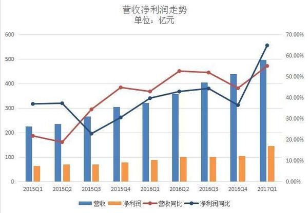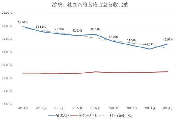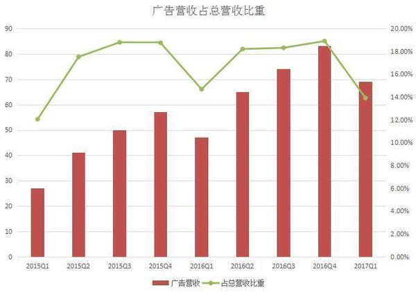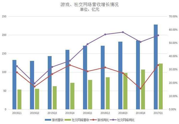 在騰訊發(fā)布新一季度財(cái)報(bào)之前,一眾剖析師都非常看好。而在這之前,羅永浩曾直言“騰訊股市漲得比北京房價(jià)好”。那么騰訊新一季度的效果到底有剖析師所猜測的那么好嗎?別的收割很多玩家的《玩著榮耀》游戲又給騰訊奉獻(xiàn)了多少收入? 5月17日,騰訊發(fā)布了2017財(cái)年第一季度的效果陳述。該季度公司的營收為495.52億元(71.82億美元 ),同比增加55%;運(yùn)營盈余192.72億元(27.93億美元),同比增加44%;公司權(quán)益持有人應(yīng)占盈余為144.76億元(20.98億美元),同比增加58%。 作為早年建立的互聯(lián)網(wǎng)公司之一,騰訊的開展也閱歷了幾次大的戰(zhàn)略調(diào)整。從近來兩年的財(cái)報(bào)數(shù)據(jù)來看,公司的營收和凈利潤增速在持續(xù)上升且創(chuàng)了新高。但在2015Q2和2016Q4這兩個季度,營收曾遭受下滑。 騰訊開始以及時通訊東西發(fā)家,現(xiàn)在公司的事務(wù)現(xiàn)已掩蓋游戲、交際網(wǎng)絡(luò)、付出、云核算等。從營收構(gòu)造來看,公司首要有增值效勞事務(wù)營收、網(wǎng)絡(luò)廣告事務(wù)營收和別的事務(wù)營收三大首要來歷。其間,增值效勞事務(wù)依然為公司奉獻(xiàn)了最多的收入。 游戲立異高,占總營收比重有所上升 作為騰訊最掙錢的事務(wù)大頭,該季度公司的增值效勞營收同比增加41%至351.08億元。 其間,來自網(wǎng)絡(luò)游戲的收入增加34%至228.11億元。游戲事務(wù)增加首要由智能手機(jī)游戲(如《王者榮耀》、《穿越前方:槍戰(zhàn)王者》及《龍之谷》)及PC客戶端游戲(如《英豪聯(lián)盟》、《FIFA Online 3》及《地下城與勇士》)所奉獻(xiàn)。盡管這次騰訊沒有發(fā)布《王者榮耀》的詳細(xì)效果,但上個季度公司曾泄漏游戲的日活潑用戶超越了5000萬。 詳細(xì)來看,來自PC客戶端的游戲收入為141億元,同比增加24%;來自智能手機(jī)游戲的收入為129億元,同比增加57%。 別的,來自交際網(wǎng)絡(luò)的收入增加56%至122.97億元。該項(xiàng)收入增加首要反映數(shù)字內(nèi)容效勞(包含數(shù)字音樂、視頻及文學(xué)效勞)及虛擬道具銷售收入的增加。 近來幾年,經(jīng)過自研IP游戲、代理游戲以及“買買買”的方法騰訊現(xiàn)已是全球最掙錢的游戲公司。正如剖析師所猜測的,騰訊的游戲收入又帶來了“驚喜”——創(chuàng)了前史新高。 不過,為了疏解收入構(gòu)造單一帶來的潛在危險(xiǎn),騰訊一向都在擴(kuò)大別的事務(wù)的營收,然后降低游戲在總收入中的占比。 從游戲和交際網(wǎng)絡(luò)營收增速的比照圖來看,近來兩年時間里前者都要慢于后者。從這兩項(xiàng)事務(wù)占公司總營收的比重來看,交際網(wǎng)絡(luò)一向保持在20%-30%之間。而游戲收入占比則在直線降低,在2016Q2降低至50%一下,在2016Q4占比僅為42.14%。但到了該季度,占比又有所上升。 網(wǎng)絡(luò)廣告營收增速趨于穩(wěn)定,交際廣告同比增加67% 除了游戲外,網(wǎng)絡(luò)廣告算是騰訊要點(diǎn)規(guī)劃的事務(wù)之一了。 在這之前,騰訊曾調(diào)整了廣告事務(wù)的人事錄用,以進(jìn)一步挖掘該事務(wù)的潛在價(jià)值并提高它的戰(zhàn)略地位。此前還有業(yè)內(nèi)人士剖析認(rèn)為,未來騰訊也許會開展成了一個以廣告事務(wù)為主的公司,比方廣告營收占比高達(dá)85%的Facebook。 該季度網(wǎng)絡(luò)廣告的營收同比增加47%至68.88億元。但比較2016Q3和2016Q4的74億元和83億元則有所降低。從曩昔兩年的數(shù)據(jù)來看,來自網(wǎng)絡(luò)廣告的增速現(xiàn)已離別之前動輒三位數(shù)的增加,而保持在40%-50%之間。 從廣告占總營收的比重來看,比較前幾季度也有所降低,為13.91%。這一數(shù)字要低于交際網(wǎng)絡(luò)在總營收中的占比。關(guān)于廣告事務(wù)的開展,騰訊現(xiàn)已在國內(nèi)外進(jìn)行積極的規(guī)劃,不知道終究是否能取得不錯的效果。 在該季度,騰訊對廣告事務(wù)的詳細(xì)區(qū)分進(jìn)行了調(diào)整。不再是效果廣告和品牌展現(xiàn)廣告,而是按廣告特點(diǎn)和非廣告特點(diǎn)來區(qū)分: