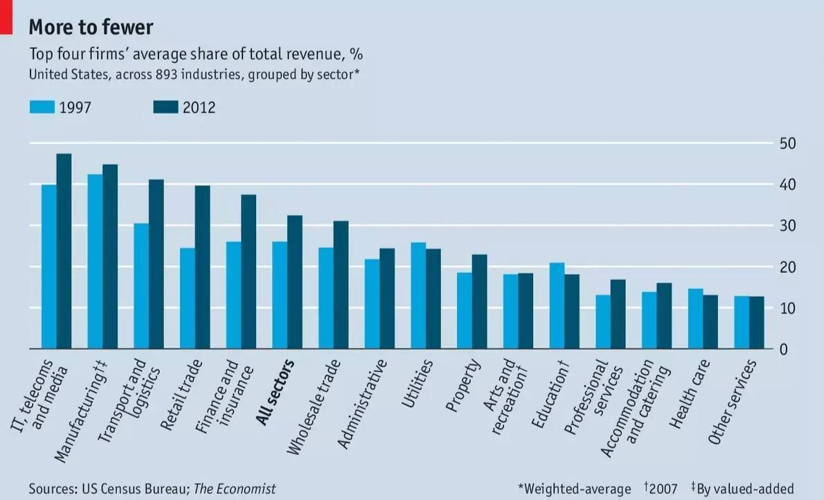 收入的不平等進(jìn)一步加重 盡管如此,別的專家的研討還顯現(xiàn),跟著市場集中度越來越高,市場位置高的公司越來越強(qiáng),草創(chuàng)公司取得成功的才能也更加降低。因?yàn)閷φ坌略鼍蜆I(yè)崗位都發(fā)源自成功的草創(chuàng)公司,這種狀況也按捺了新就業(yè)時機(jī)的發(fā)生。 彼得·歐爾薩格(Peter Orszag)曾在《彭博視角》(Bloomberg View)節(jié)目撰文指出,超級明星公司取得遠(yuǎn)超正慣例劃的出資報答,進(jìn)一步加重收入上的不平等,也就家常便飯了。歐爾薩格與貝拉克·奧巴馬(Barak Obama)總統(tǒng)任內(nèi)的經(jīng)濟(jì)參謀委員會主席賈森·富爾曼(Jason Furman)一起指出,本錢報答率的進(jìn)步并沒有帶來對公司出資添加——這是獨(dú)占力氣構(gòu)成的另一表現(xiàn)。 反獨(dú)占滯后 有些芝加哥學(xué)派成員對此表明附和。該學(xué)派是現(xiàn)代反獨(dú)占理論的源頭。20世紀(jì)70到80年代,芝加哥大學(xué)的一群專家經(jīng)過論辯顛覆了反獨(dú)占法。他們以為,并購發(fā)生的經(jīng)濟(jì)效率進(jìn)步,其好處足以跨越對公司規(guī)劃的任何憂慮。例子觸及消費(fèi)者福祉:并購是不是給兼并后的公司帶來進(jìn)步消費(fèi)者報價的權(quán)利,以及并購后職業(yè)準(zhǔn)入門檻是不是會高到新來者無法輕松跨越的程度?美國反獨(dú)占法的執(zhí)法者們發(fā)生了不堅(jiān)定。從1970到1999年,美國每年均勻提交15.7起反獨(dú)占訴訟案。這以后這一數(shù)字一路降低,2000到2014年間降至了缺乏3起。