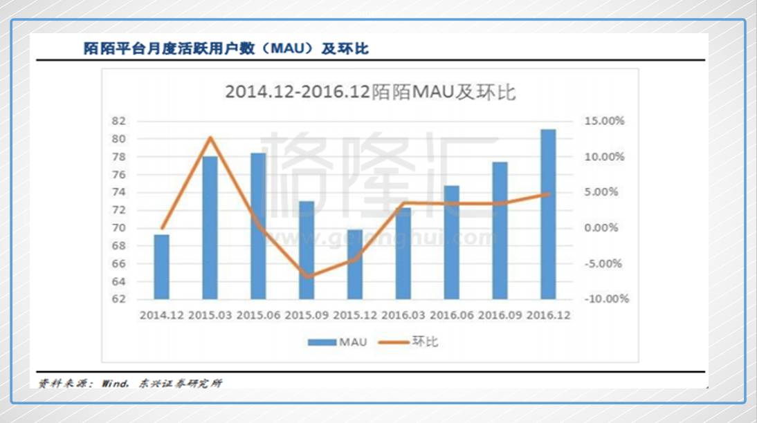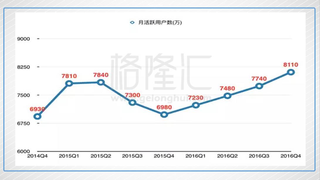 天然,陌陌股價這么的大漲,離不開其牛X的成果增加。2016年是直播大發(fā)展的一年,陌陌依托著直播的風口取得了驚人的成果——16年收入同比增加313%,贏利則翻了9.6倍。同時,在直播的股動下,其要害的月活(MAU)也得以康復增加,去年底陌陌渠道月活數(shù)為8110萬,實在是打了一個美麗的翻身仗。