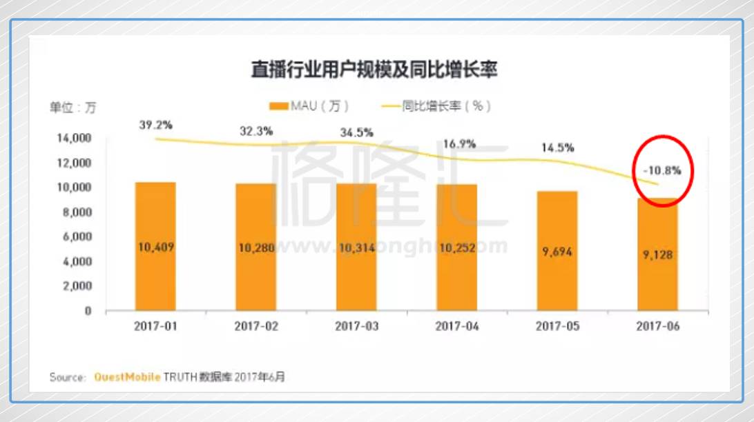 因為方針趨嚴,直播內容遭到很大約束,加之內容同質化嚴重,許多渠道都呈現(xiàn)了用戶丟失的景象。依據(jù)QuestMobile最新發(fā)布的陳述顯現(xiàn),直播職業(yè)月活潑用戶規(guī)劃從2017年1月的10409萬人,降至6月的9128萬人,同比增加為-10.8%。這是直播職業(yè)用戶規(guī)劃初次呈現(xiàn)負增加。