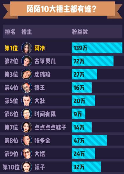 陌陌在2016年選舉了年度10大主播,依據(jù)陌陌提供的資料顯現(xiàn),人氣最高的阿冷粉絲數(shù)量在139萬,剩余的主播粉絲量級均未過百萬。