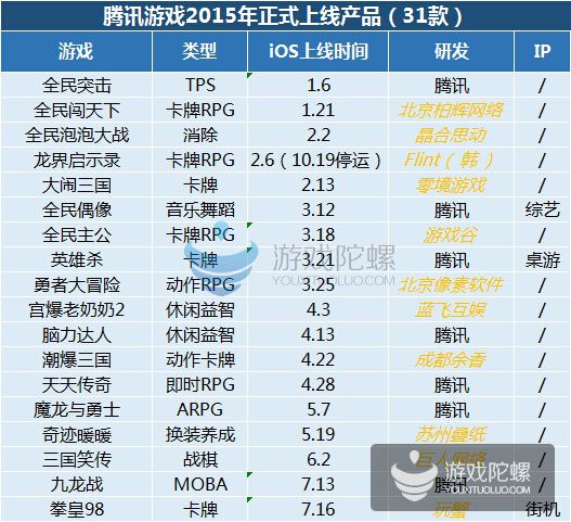 (僅統(tǒng)計2016年1月31日App Store當天暢銷榜,騰訊發(fā)行游戲排名) 實在我們結(jié)合這幾年的騰訊手游發(fā)行情況,騰訊的主要策略仍是獲取用戶為主,由于在之前幾年中渠道擁有很大的上風(fēng)。騰訊70%的產(chǎn)品都是基于大品類籠蓋,包括跑酷、飛行射擊。但跟著人口紅利上風(fēng)衰減,用戶不斷成熟,渠道已經(jīng)不能決定用戶選擇游戲的方向,游戲本身的質(zhì)量已經(jīng)越來越重要,越來越多的用戶開始有了明確需求。細分市場,垂直用戶以及精品產(chǎn)品成為了騰訊的基本打法,這一策略也被市場所驗證。不外手游生命周期的題目,依舊困擾著所有從業(yè)者,如何延長?最靠譜的方式仍是MMO,這個被端游、頁游市場驗證過的形式。不光騰訊,2016年所有的大廠都往這個方向靠攏。 2015年騰訊發(fā)行的重點產(chǎn)品已經(jīng)集中在了重度類型,當然騰訊內(nèi)部的分類沒有輕、中、重,而是按類型分,以這個尺度看:卡牌、休閑、MOBA、FPS四類為主。IP類產(chǎn)品在騰訊2015的手游中表現(xiàn)十分凸起。但顯然騰訊還有大量的IP產(chǎn)品和來自合作CP的產(chǎn)品。