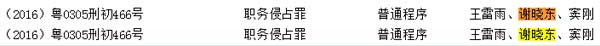雷帝網(wǎng)從深圳南山法院官網(wǎng)發(fā)現(xiàn),王雷雨、謝曉東、竇剛已被深圳南山區(qū)人民法院立案,案件號為(2016)粵0305刑初466號,罪名是職務(wù)侵占罪,在2016年5月19日已開庭審理。