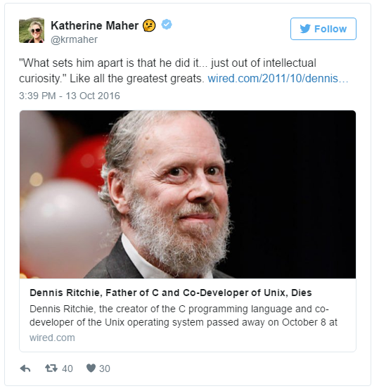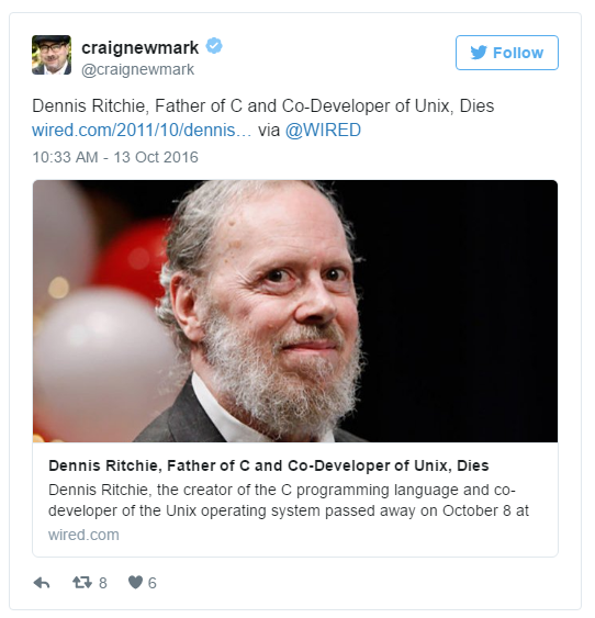 Dennis Ritchie 對于現(xiàn)代軟件技術(shù)的貢獻(xiàn)是毋庸置疑的,身為 C 語言同時(shí)也是 UNIX 之父,對于現(xiàn)代軟件以及系統(tǒng)的影響當(dāng)然非常大。他在 2011 年 10 月 13 日于紐澤西過世,當(dāng)時(shí)引起很多科技業(yè)重量級人物的哀悼。不外,基于某些錯(cuò)誤,他近日在 Twitter 上“再度”過世了一次。 在社交網(wǎng)站上都有一些演算法的機(jī)制,會(huì)回顧過去幾年這一天所發(fā)生的信息。有的時(shí)候我們一不小心沒有留意日期,就會(huì)誤認(rèn)為是當(dāng)天所發(fā)生的事情。而這個(gè)在美國科技圈發(fā)生的烏龍事件,不清晰是不是也是由于這個(gè)演算法所引起的。 事情到底是誰開始?不外根據(jù) fossbytes的考證,溯源追蹤到 CNET 的科技界著名記者 Om Malik,他在 Twitter 發(fā)了一篇引述 Wired 報(bào)導(dǎo)、哀悼 Dennis Ritchie 的推文。而 Google 的 CEO Sundar Pichai 也推了這篇文章。 因?yàn)?Om Malik 的影響力,接下來又引出了兩位科技界的大咖的轉(zhuǎn)推。像是 Craig Newmark,Craigslist 的創(chuàng)辦人。 Katherine Maher 目前負(fù)責(zé)主管 Wikimedia 基金會(huì)。 因?yàn)檫@些科技大咖的影響力,當(dāng)然這個(gè)“謠言”就開始在科技圈傳開了,一大堆人開始在 Twitter 上對 Dennis Ritchie 進(jìn)行哀悼。 事情一直到 Om Malik 自己發(fā)現(xiàn)了錯(cuò)誤,他連忙在自己的博客上發(fā)布了一篇報(bào)歉文,表示自己分享了一篇 Wired 的報(bào)導(dǎo),卻沒有留意到報(bào)導(dǎo)的日期,沒有發(fā)現(xiàn) Dennis Ritchie 早在與喬布斯過世的統(tǒng)一年就“已經(jīng)”過世了。 不外,往好處想也由于這個(gè)原因,讓 Dennis Ritchie 他對于眾人的貢獻(xiàn)再度被喚醒。 |