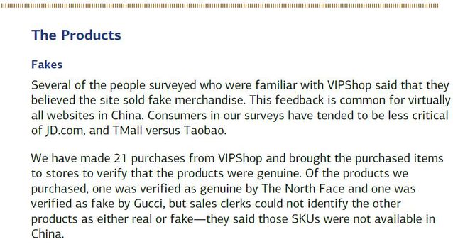 對于閃購模式的唯品會而言,品牌在劃定的時間內(nèi)上新,通過折扣的方式,來刺激消費者快速決議計劃購買。在唯品會的首頁上,每個品牌上新的位置都很有限,也都意味著巨大的利益牽扯。一位曾上過唯品會的商家透露,唯品會在招商控制上層層審批,但想上唯品會(特別是首頁)的品牌商趨之若鶩。即便治理上很嚴格,但仍是避免不了一些“潛規(guī)則”。 事實上,聯(lián)系關(guān)系交易本身并不違法,根據(jù)SEC的要求,與上市公司產(chǎn)生聯(lián)系關(guān)系交易的行為必需要對外表露。這也是考慮到,聯(lián)系關(guān)系交易方可以運用行政氣力撮合交易的進行,從而有可能使交易的價格、方式等在非競爭的前提下泛起不公正情況,形成對股東或部門股東權(quán)益的侵犯,也易導(dǎo)致債權(quán)人利益受到損害。 售賣未經(jīng)品牌商授權(quán)的商品 贗品對于電商來說,是一個“惡疾”。JCAP講演中夸大,調(diào)查了多位消費者,均表示在唯品會上買到過贗品。 JCAP調(diào)查職員抽選了21個調(diào)查樣本,去品牌商的線下實體店驗貨,其中樣本中的Gucci被證明為贗品,其余的商品樣本,銷售職員也無法辨明真?zhèn)巍?ldquo;這些商品的型號并沒有在中國銷售。”