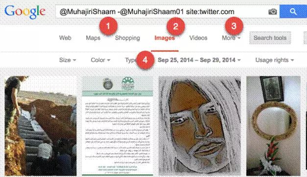 Echosec和Geofeedia可將人物和地點(diǎn)聯(lián)系起來 在這個(gè)例子中,我鍵入了殼牌總部的地址(1)但愿找到特定時(shí)間(2)內(nèi)在那里工作的人(3)發(fā)布的信息。 8.在Google Images里搜索圖片 良多時(shí)候用戶會(huì)刪除他們發(fā)布的信息,這時(shí)候你就無法在Echosec or Geofeedia里檢索到這些信息。但是你仍是可以通過Google Images來搜尋這些信息。 在下面的例子中,我要檢索Twitter(3)上一個(gè)名字是@MuhajiriShaam (1)的賬號(hào),首先要剔除一個(gè)非常類似的賬號(hào)@MuhajiriShaam01 (2),然后查看他在9月25日到9月29日之間(4)在Twitter上發(fā)布的照片。