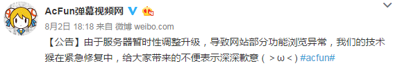 A站2016年8月2日就在官方微博上表示,因為A站服務(wù)器暫時性調(diào)整進(jìn)級,導(dǎo)致網(wǎng)站部門功能瀏覽異常,A站的技術(shù)職員在緊急修復(fù)中,給大家?guī)淼牟槐惚硎旧钌钋敢狻?/p>