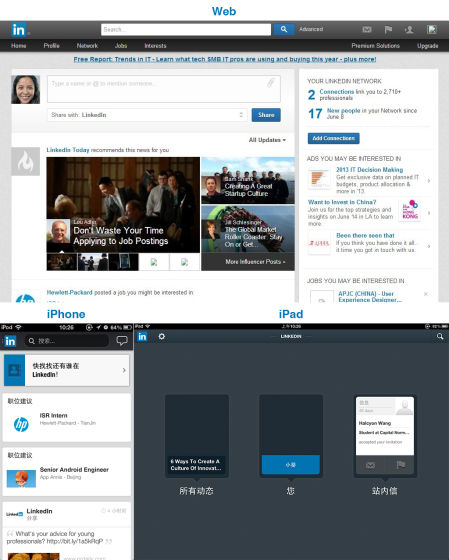 圖為 LinkedIn 的 Web、iPhone 和 iPad 版。
