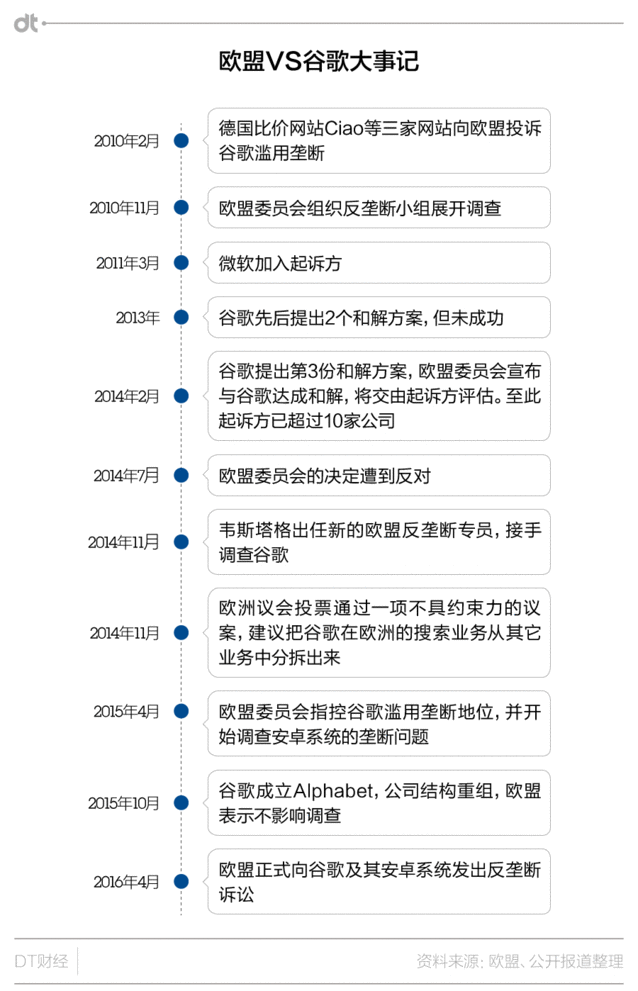 事情大概是這樣的:2010年下半年,幾家搜索及比價(jià)網(wǎng)站指控谷歌利用其搜索上風(fēng)推廣自家服務(wù),損害競(jìng)爭(zhēng)對(duì)手利益。之后歐盟對(duì)谷歌的反壟斷調(diào)查開(kāi)始,這一被形容為“史詩(shī)級(jí)”的訴訟正式拉開(kāi)序幕。在之后的近6年的調(diào)查中,谷歌曾先后三次提出和解方案,但終極都被拒絕。