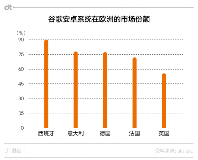 根據(jù)statista的統(tǒng)計(jì),安卓在歐洲各國(guó)的市場(chǎng)份額很高,在西班牙甚至達(dá)到了九成。
