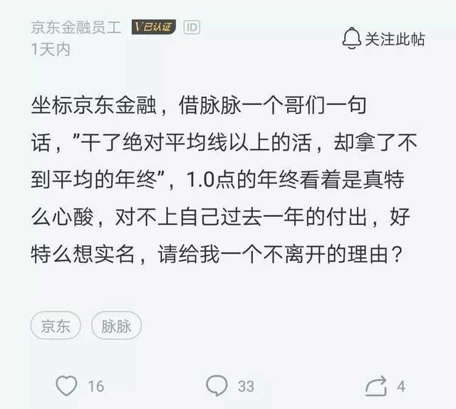 發(fā)年終獎(jiǎng)的日子,有人歡喜有人憂。在互聯(lián)網(wǎng)行業(yè)社區(qū),一名標(biāo)簽為京東金融的職工顯得分外憤慨,發(fā)飆起來(lái):干了絕對(duì)均勻線以上的活,卻拿了不到均勻的年終,