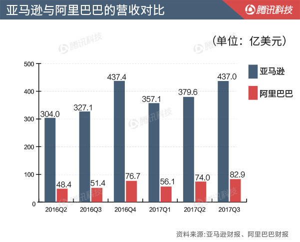 亞馬遜、阿里巴巴相繼發(fā)布2017年第三季度財(cái)報(bào)。亞馬遜本年體現(xiàn)亮眼,但阿里巴巴體現(xiàn)更好。阿里巴巴趕超亞馬遜的腳步更近了。市值方面,阿里巴巴也曾在10月10日盤中一度超過亞馬遜。