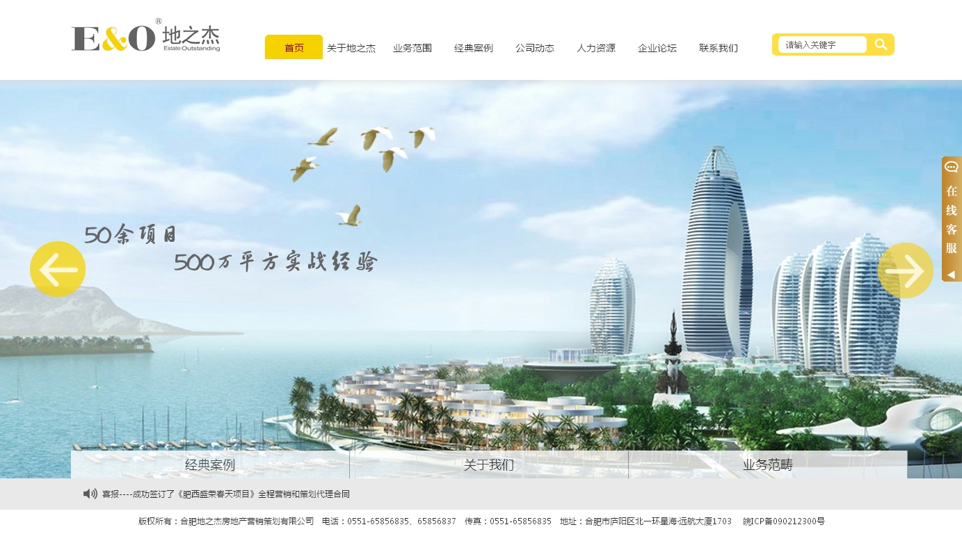 合肥地之杰房地產(chǎn)営銷策劃有限公司成立于2007年.公司自成立以來,始終把自己定位于專業(yè)地產(chǎn)顧問 公司:以合肥立足點專注地為安徴二.三線城市地產(chǎn)商服務.此務范圍涵兼住宅地產(chǎn),商業(yè)地產(chǎn)以及體育、 休閑、旅游等綜合類地產(chǎn):業(yè)務領域渉及到前期投資咨詢、開發(fā)顧問、產(chǎn)品規(guī)劃設計踴問、銷售代理.銷售回 款廣告策劃與推廣活動組織與執(zhí)行,物業(yè)顧問等地產(chǎn)開發(fā)投資十幾個環(huán)節(jié)•合肥地之杰努力做安徽本 土領先的地產(chǎn)綜合服務商!