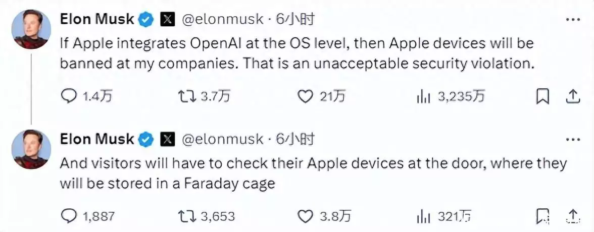 在批判OpenAI這件事上,馬斯克總是沖在第一線,孜孜矻矻營(yíng)業(yè),不遺余力地揭示OpenAI在迷失本心、AGI安全治理、信息泄露等方面的諸多問(wèn)題。馬斯克與蘋(píng)果之間的糾葛似乎由來(lái)已久。
