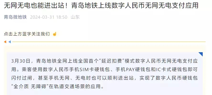 青島地鐵在2024年3月30日全網(wǎng)上線了全國首個“延遲扣費”模式的數(shù)字人民幣無網(wǎng)無電支付應(yīng)用,這一創(chuàng)新舉措使得乘客即使在手機(jī)無網(wǎng)、無電的情況下,也能順利進(jìn)出站。