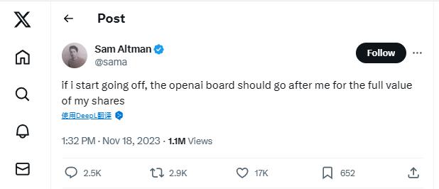 在OpenAI公司內(nèi)部,一場關(guān)于是否應(yīng)該“開火”的爭論正在上演。 當(dāng)?shù)貢r(shí)間2月15日,阿爾特曼在推特上回應(yīng)了OpenAI聯(lián)合創(chuàng)始人兼CEO山姆·阿爾特曼(Sam Altman)周三的一條推文。
