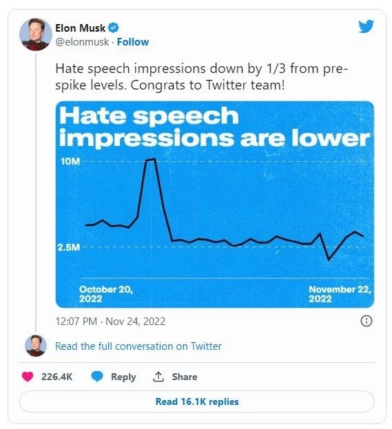 11 月 25 日消息,埃隆・馬斯克(Elon Musk)今日發(fā)布推文表明,自接手 Twitter 以來,用戶對(duì)該社交渠道的仇視言觀感有所改善。馬斯克稱,