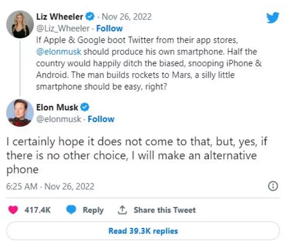 近來,視頻播客節(jié)目Liz Wheeler Show的主持人利茲·惠勒發(fā)推文表明,“假如蘋果和谷歌從它們的使用商鋪移除推特,馬斯克應(yīng)該生產(chǎn)自己的智能手機(jī)。
