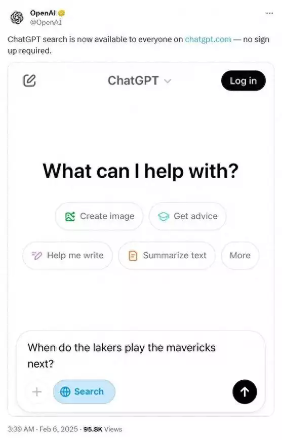 2025 年 2 月 6 日凌晨 3 點(diǎn),OpenAI 宣布向所有用戶(hù)開(kāi)放 ChatGPT 搜索功能,且無(wú)需注冊(cè)。這一舉措可能對(duì)谷歌等傳統(tǒng)搜索引擎造成沖擊,給搜索引擎市場(chǎng)帶來(lái)多方面變革,